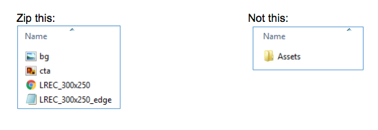 - When packaging HTML5 creatives, include the asset files, not the folder containing them, in the ZIP file. See "Zip This" and "Do Not Zip This" attachments for reference.