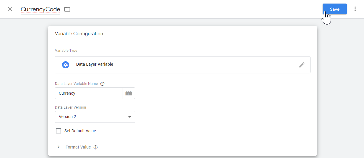 - Enter the name of the data layer variable. In this example: Currency. The name must exactly match the value in the dataLayer object. The user-defined variable includes the data layer variable, so it's a good idea to have slightly different names, for clarity.
