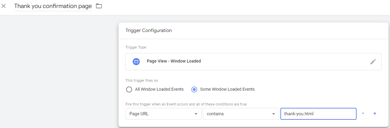 - Provide a name for the trigger. This example uses Thank you confirmation page.